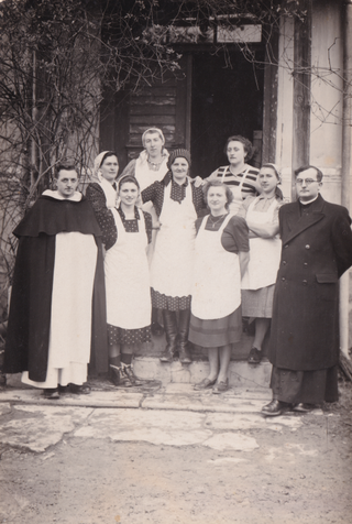 Skupna slika egzercicijov za žene s farnikom Alfredom Grubitsem i paterom Innozenz Vargom početkom 1950-ih ljet.