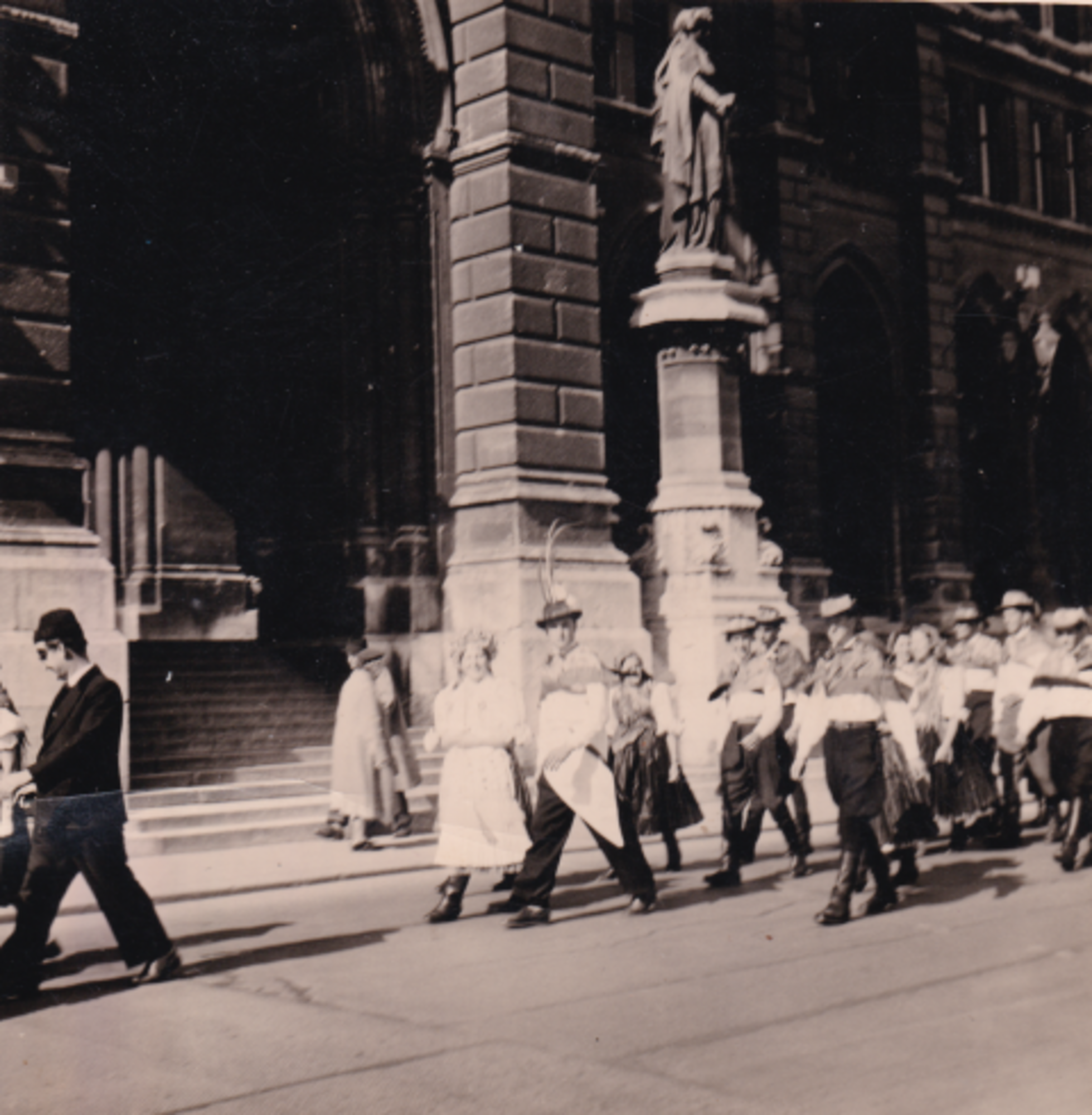 Folklorna grupa iz Stinjakov u Beču. Najprt idu posnašnica Aca Pafkina i Jože Pekov/Pöll)