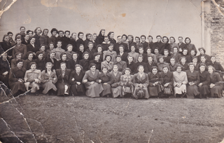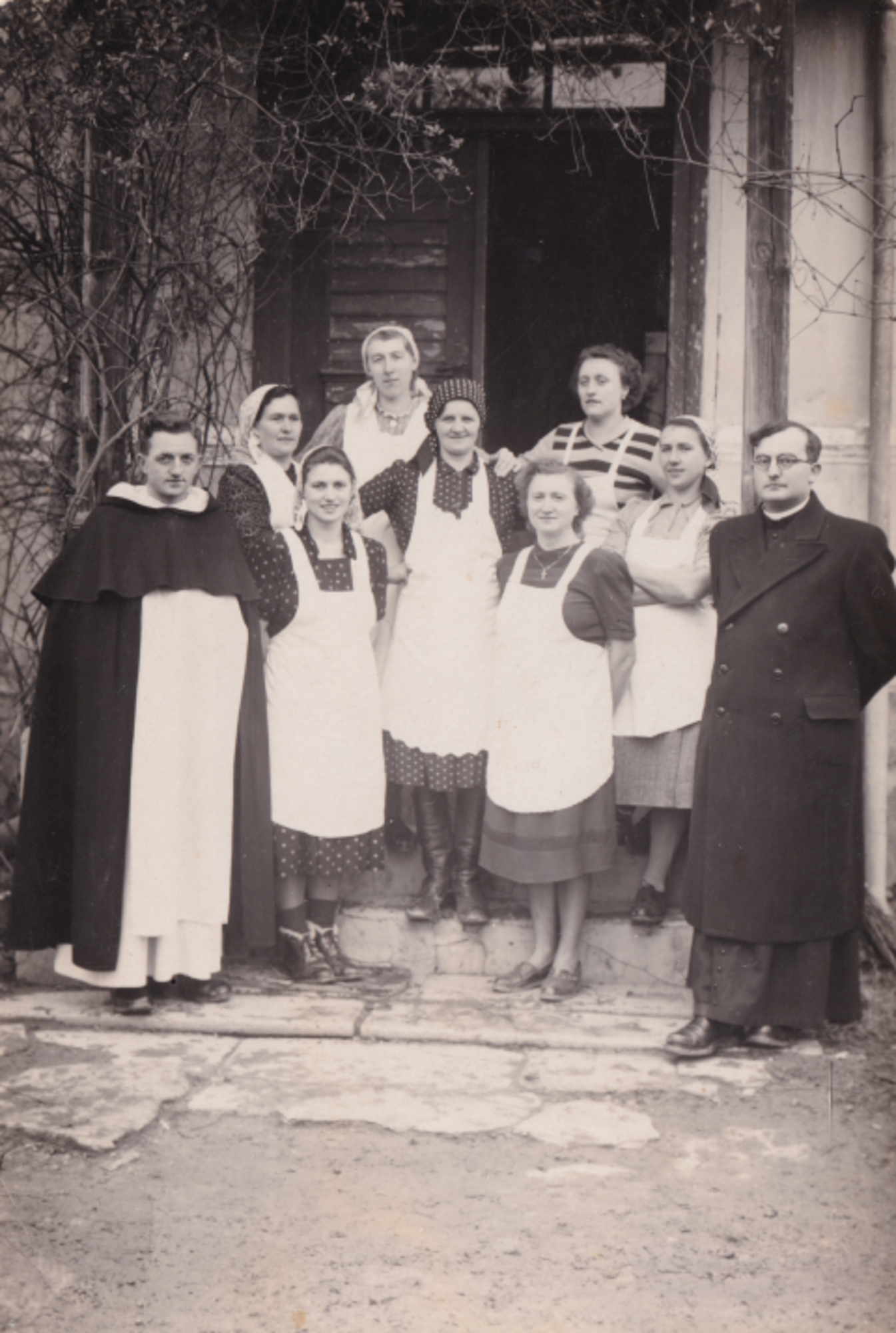 Köchinnen mit Pater Innozent Varga und Pfarrer Alfred Grubits Anfang der 1950er Jahre. Das Foto könnte während der Exerzitien mit Pater Varga entstanden sein.