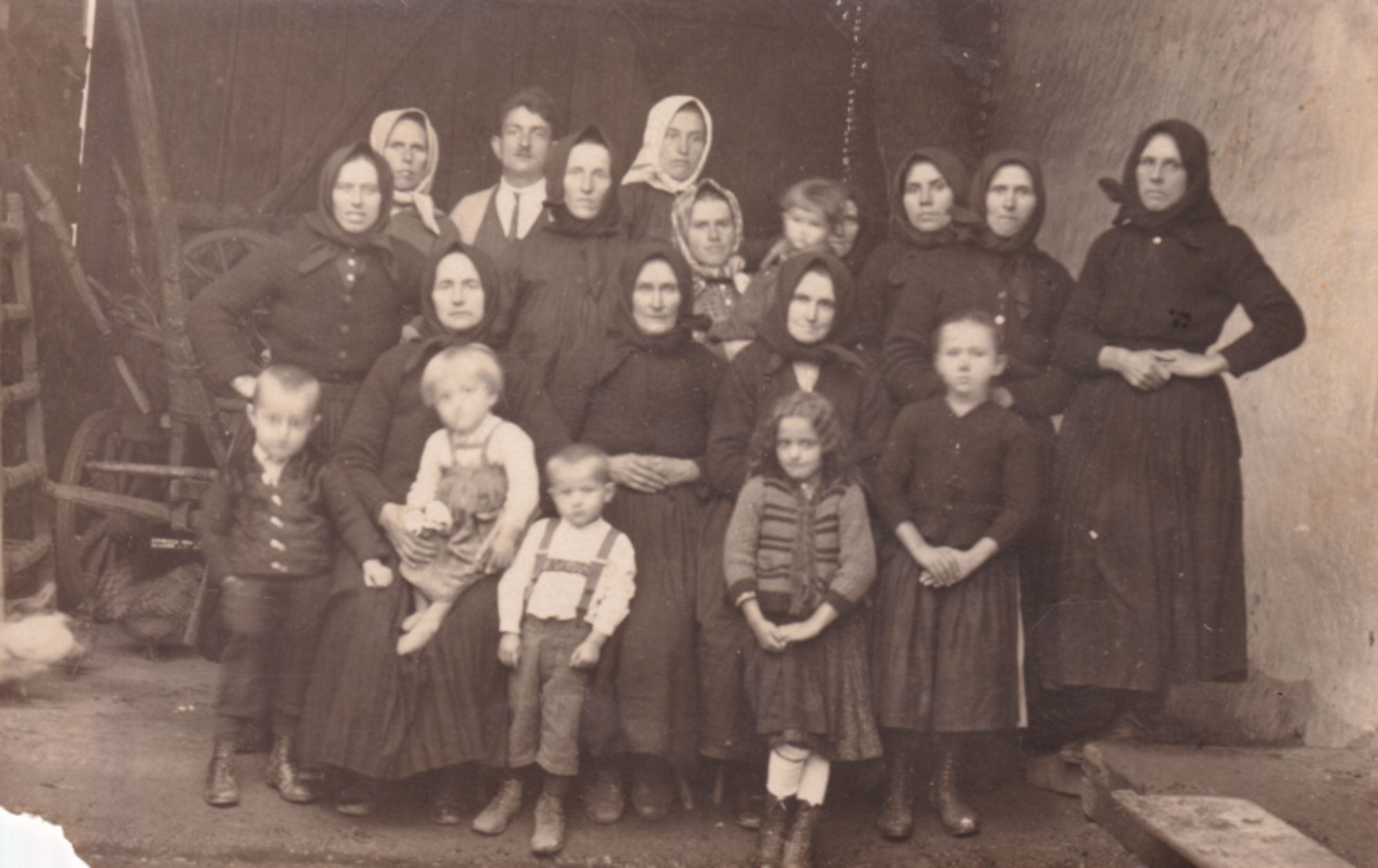 Eine Gruppe in einer Hauseinfahrt vermutlich in den 1920er Jahren. Die dritte von rechts hinten ist Angela Kirisits, das Mädchen von rechts ihre Tochter Agathe.