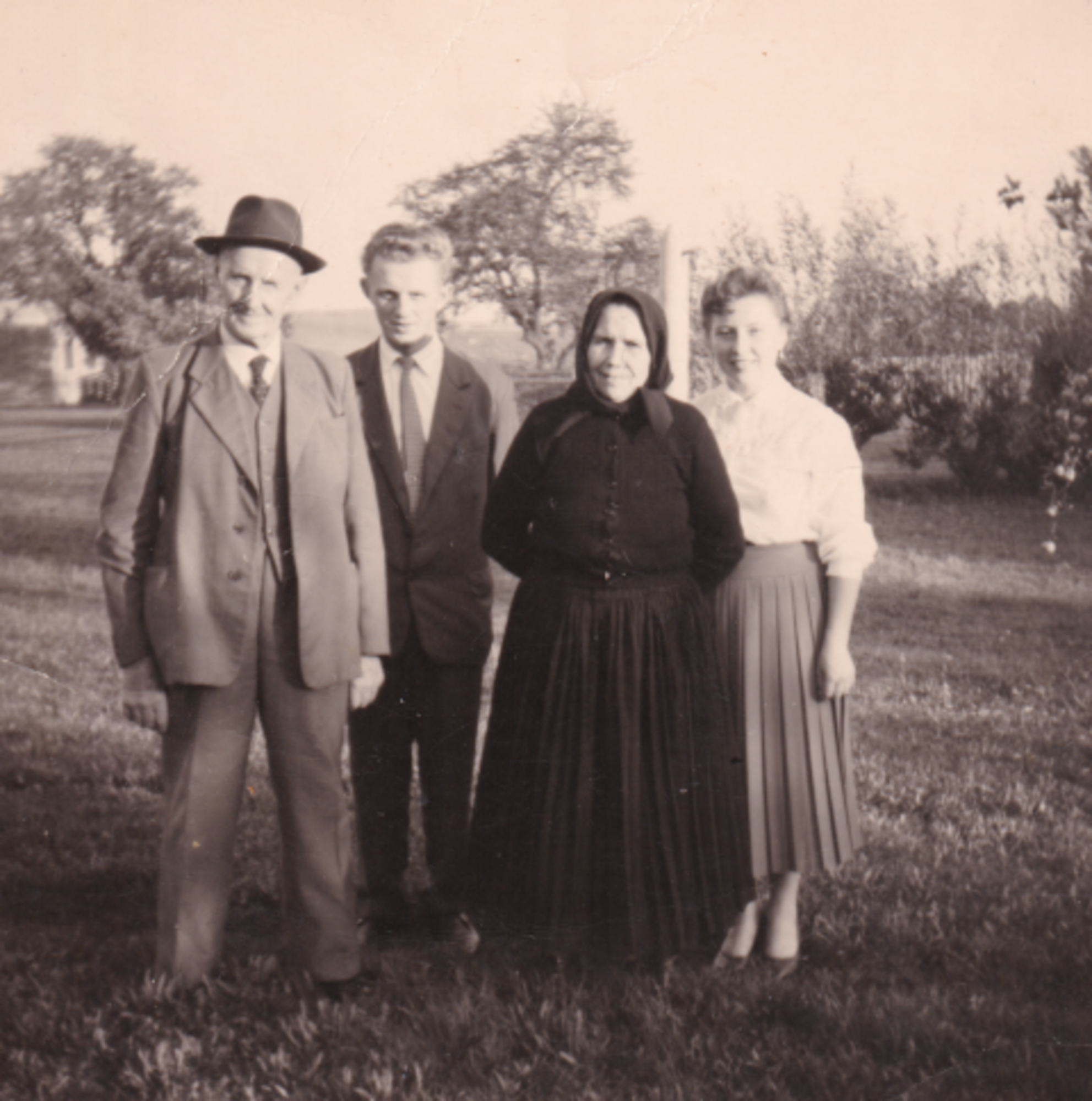 Stefan (Štife) i Angela (Gela) Kirisits s njevimi unuki Acom i Ivom kod njih na vrtli, danas glavna cesta 84, vjerojatno u sredini 1950-ih ljet.
